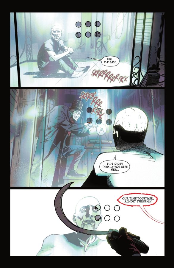 Praises: It’s a joy to see Snyder putting his all into this story arc. It’s beautifully chilling that it makes your heart race a little bit faster. He is truly creating something worth standing the test of time here. It will be one of those Batman comic books that will be the must read story arcs. The slow chilling suspense is unbearable from start to finish. You can’t take your eyes off the panels as you absorb Greg Capullo’s artwork in this issue. Capullo used a lot of cinematic skills in this issue and it paid off in full as it created a scene of horror and despair.