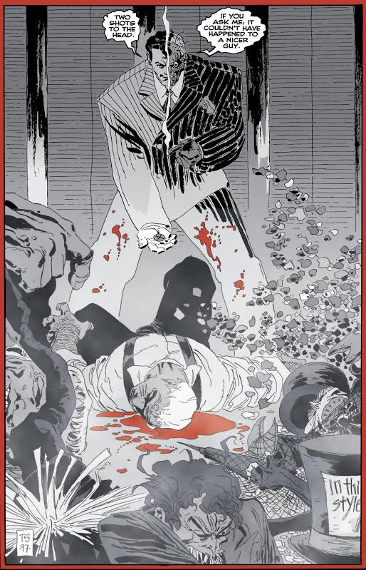 Batman, once again, breaks in to shut down the party, but gets his first glimpse of Harvey since the accident. It’s a perfectly drawn scene and is a great emotional payoff for the past 12 months. In one page, we get the death of Harvey Dent and the birth of Two-Face.
