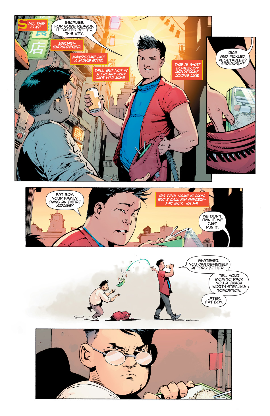“MADE IN CHINA” Chapter One: An impulsive act of heroism thrusts an arrogant young man into the limelight of Shanghai as China begins to form its own Justice League of powerful heroes. Rising from the ashes of The Final Days of Superman, award-winning writer Gene Luen Yang and on-the-rise art star Viktor Bogdanovic introduce readers to Kong Kenan—the New Super-Man! When the world needed a new hero, China made him!