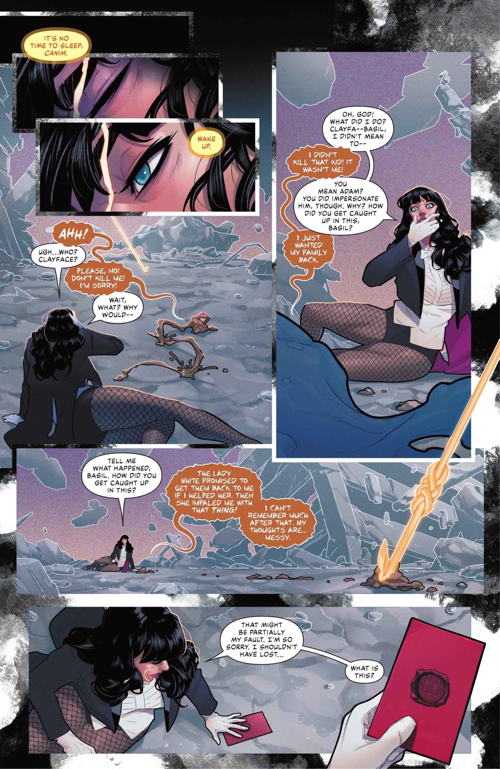 We drop in to a story time already in session. The tales unfolds of a clash of the demons Nebiros and Etrigan. Etrigan wins, skinning the fallen Nebiros and sending the skin on to its future in the hands of a future hero. Zatanna awakens to Basil’s greetings. That his alliance with the Lady White had been on the contract of a promise to help his family. An ominous red envelope holds more to it, but unknown intent, for now.
