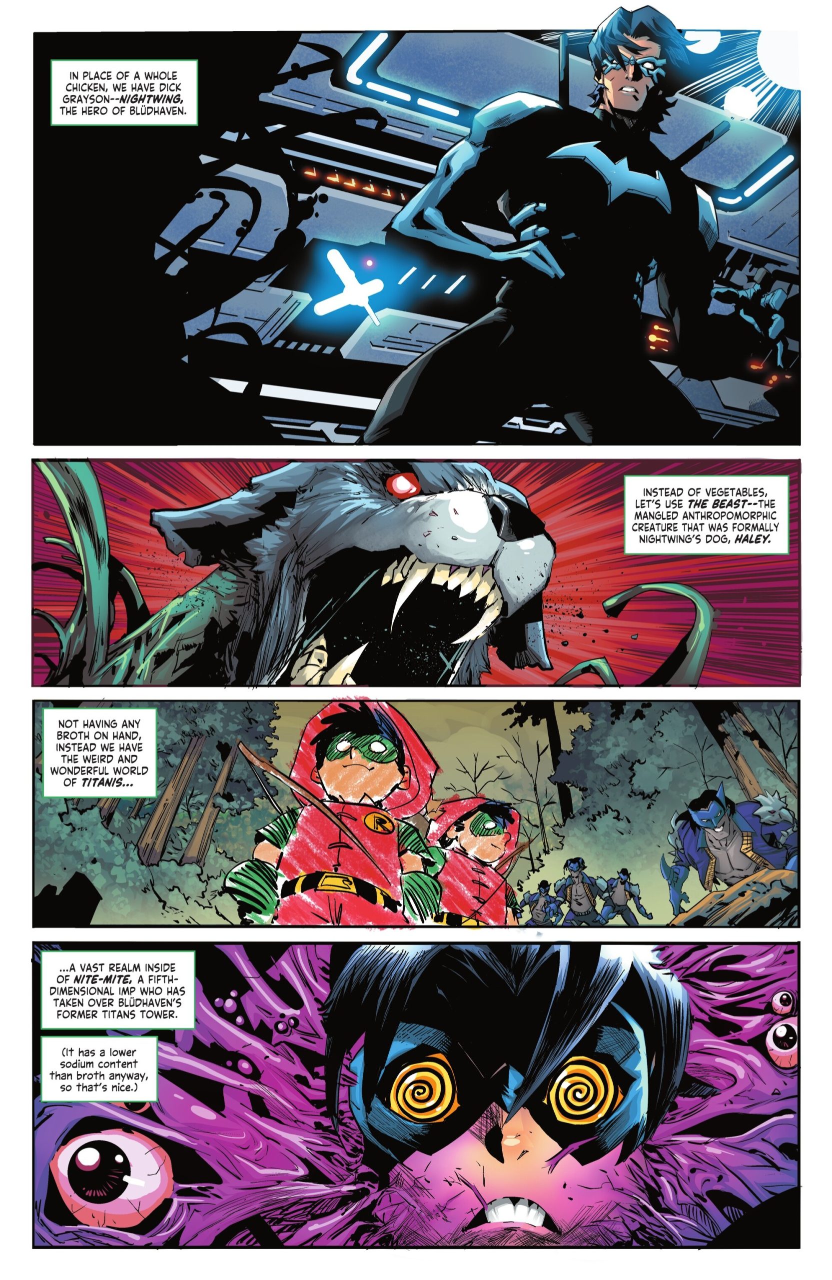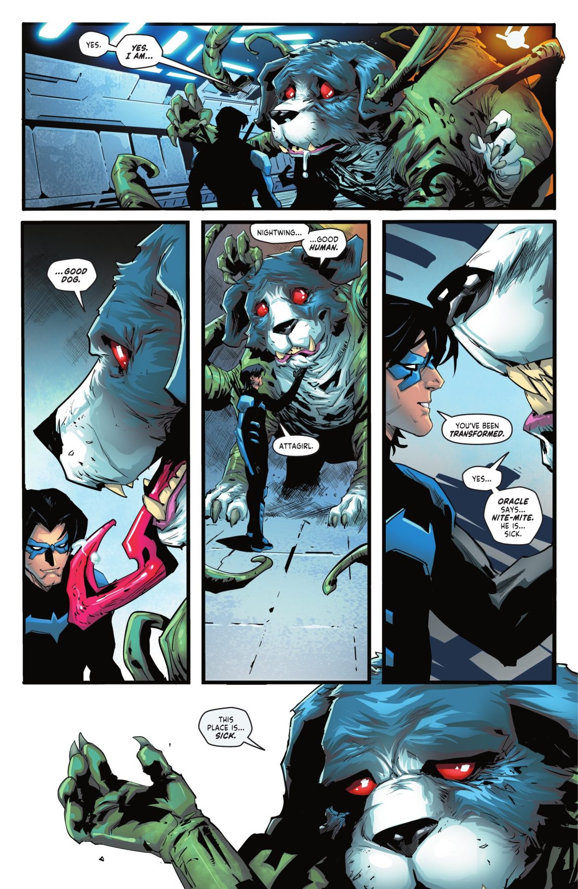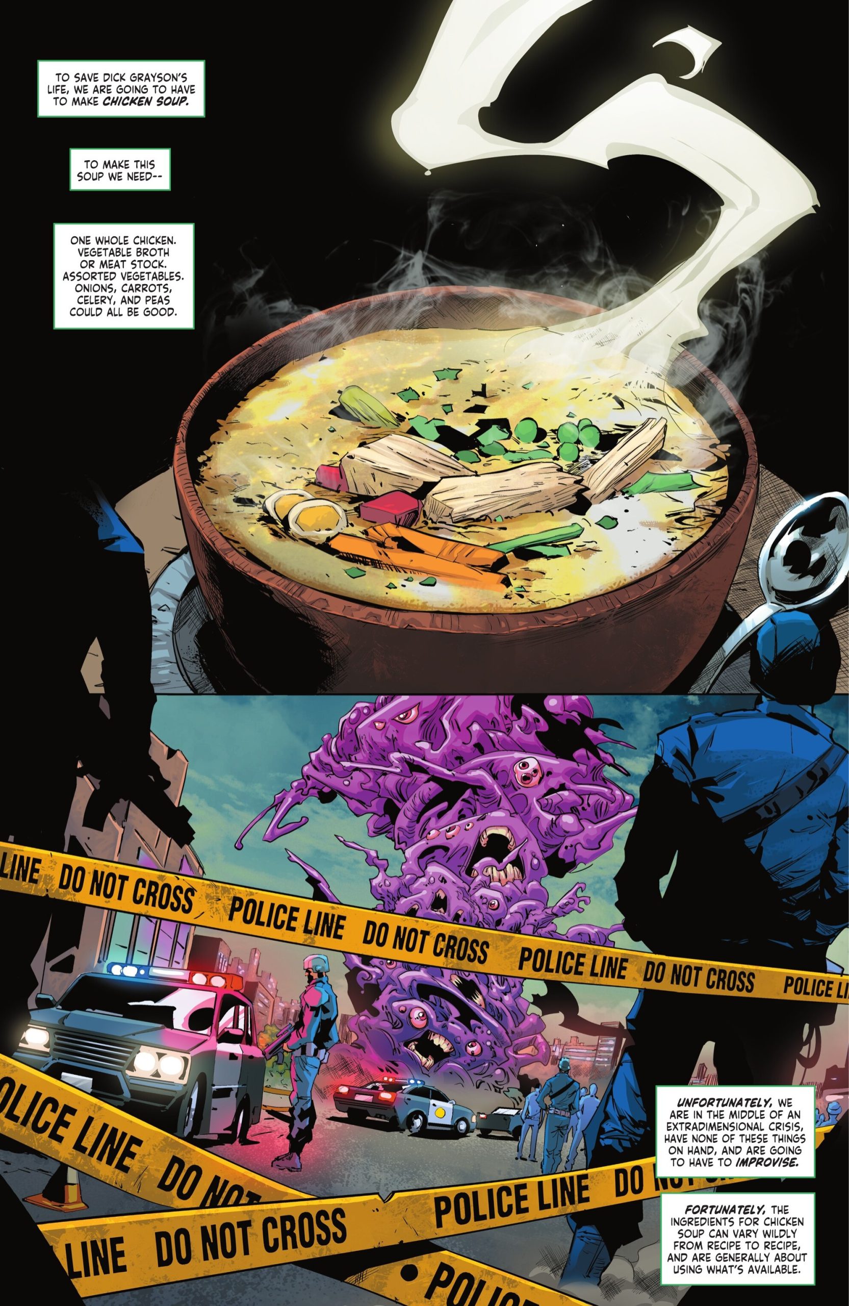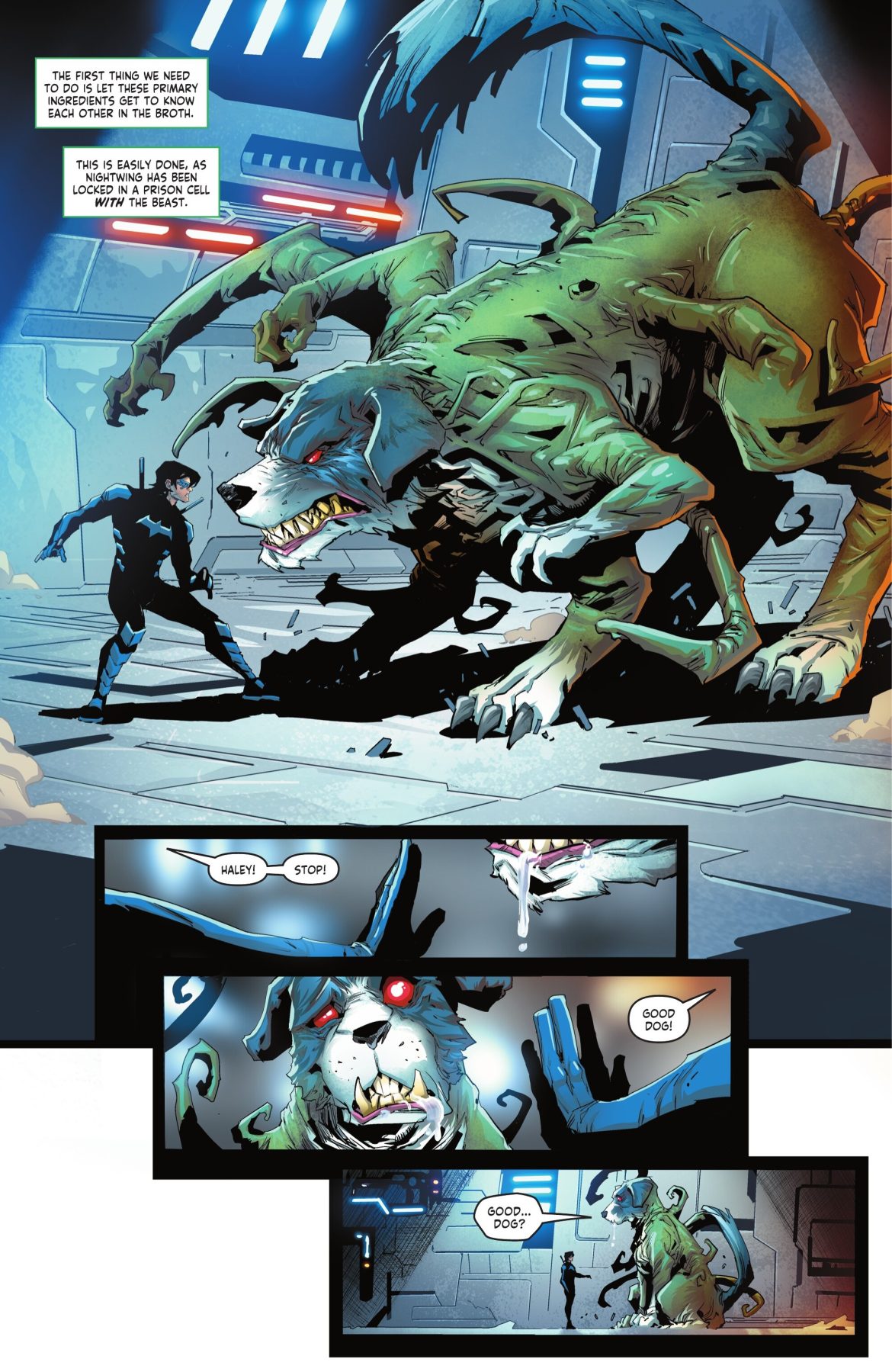 In your mind think of what would be the worst worst most hurtful damaging thing that could happen to Nightwing? Fighting Batman? Nope. Been there. Done that. Breaking up with Babs? Strike 2! Nope, seen those days come and go. He quits doing squats and loses his Night-Butt? Maybe… But no! It’s if anything ever happened to that beautiful little three legged dog of his! Last issue ended teasing a version of Haley who has been transformed into a huge monster. This issue picks up where that leaves off. I want to commend Dan Watters for freaking me the fluff out by that tease, but handling this so well. As well as the most mouth watering heart warming look at Alfred’s chicken soup, and its relationship to young Dick Grayson.