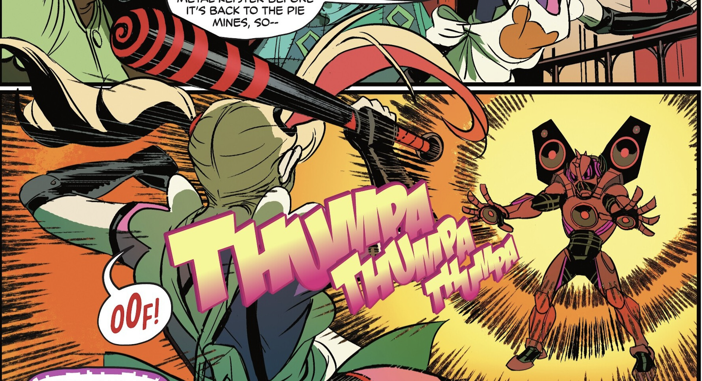There are many moments of hilarity, such as the initial reactions from the peanut gallery over Harley’s plight of dating. Ravager trying to be emotional support really was a highlight, the failure was so loud. A very memorable moment was definitely the reference to the pie crust being “tougher than Superman’s butt.”, I believe I will pass on the pie. But meeting Clang and taking on SUPR seems to also bring moments of closure and making things right. It also puts Harley in cross hairs.